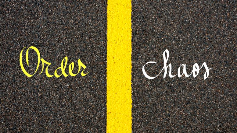 Road marking yellow paint dividing line between Order and Chaos words going in different directions, Find Your Own Way concept