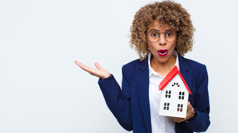 young african american woman looking surprised and shocked, with jaw dropped holding an object with an open hand on the side with house model